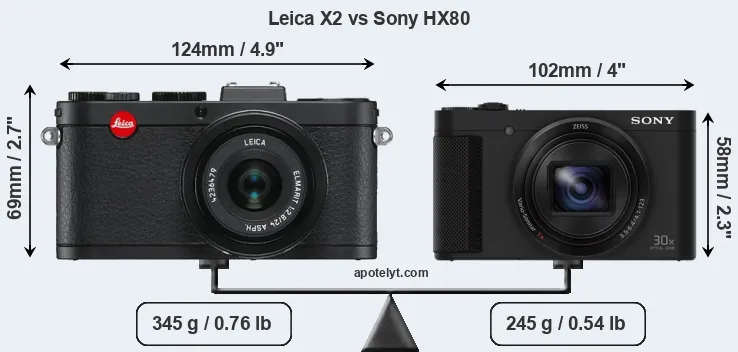 If the front view area (width x height) of the cameras is taken as an aggregate measure of their size, the Sony HX80 is considerably smaller (31 percent) than the Leica X2. Moreover, the HX80 is markedly lighter (29 percent) than the X2. In this context, it is worth noting that neither the X2 nor the HX80 are weather-sealed.