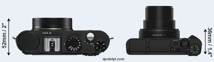 The physical size and weight of the Leica X2 and the Sony HX80 are illustrated in the side-by-side display below. The two cameras are presented according to their relative size. Three consecutive views from the front, the top, and the rear side are shown. All size dimensions are rounded to the nearest millimeter.