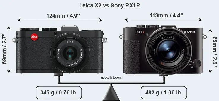 If the front view area (width x height) of the cameras is taken as an aggregate measure of their size, the Sony RX1R is notably smaller (14 percent) than the Leica X2. However, the RX1R is substantially heavier (40 percent) than the X2. In this context, it is worth noting that neither the X2 nor the RX1R are weather-sealed.