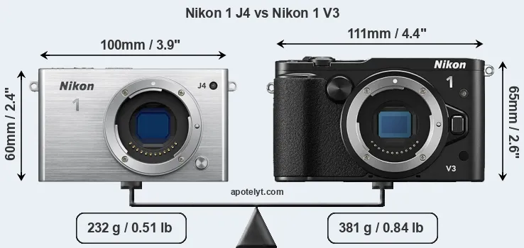 The side-by-side display below illustrates the physical size and weight of the Nikon 1 J4 and the Nikon 1 V3. The two cameras are presented according to their relative size. Three successive views from the front, the top, and the rear are shown. All size dimensions are rounded to the nearest millimeter.