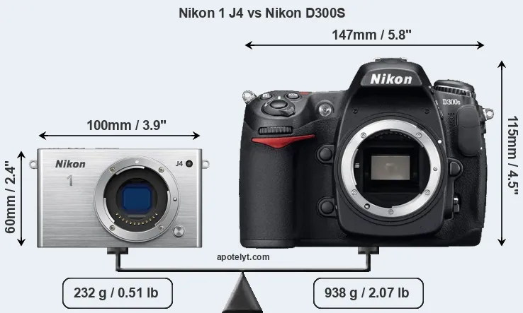 If the front view area (width x height) of the cameras is taken as an aggregate measure of their size, the Nikon D300S is considerably larger (182 percent) than the Nikon 1 J4. Moreover, the D300S is substantially heavier (304 percent) than the J4. It is noteworthy in this context that the D300S is splash and dust-proof, while the J4 does not feature any corresponding weather-sealing.