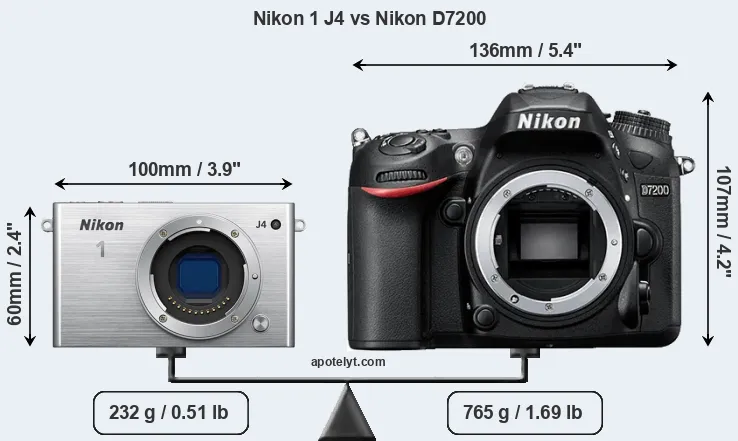 An illustration of the physical size and weight of the Nikon 1 J4 and the Nikon D7200 is provided in the side-by-side display below. The two cameras are presented according to their relative size. Three successive views from the front, the top, and the rear are shown. All width, height and depth dimensions are rounded to the nearest millimeter.