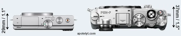 An illustration of the physical size and weight of the Nikon 1 J4 and the Olympus PEN-F is provided in the side-by-side display below. The two cameras are presented according to their relative size. Three successive views from the front, the top, and the rear are shown. All width, height and depth measures are rounded to the nearest millimeter.