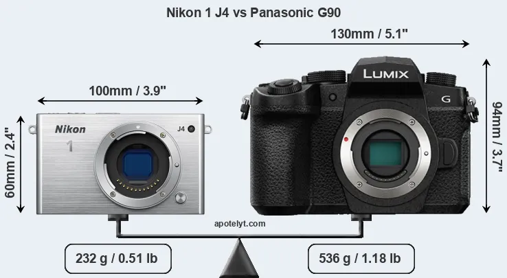 The side-by-side display below illustrates the physical size and weight of the Nikon 1 J4 and the Panasonic G90. The two cameras are presented according to their relative size. Three consecutive perspectives from the front, the top, and the back are available. All size dimensions are rounded to the nearest millimeter.
