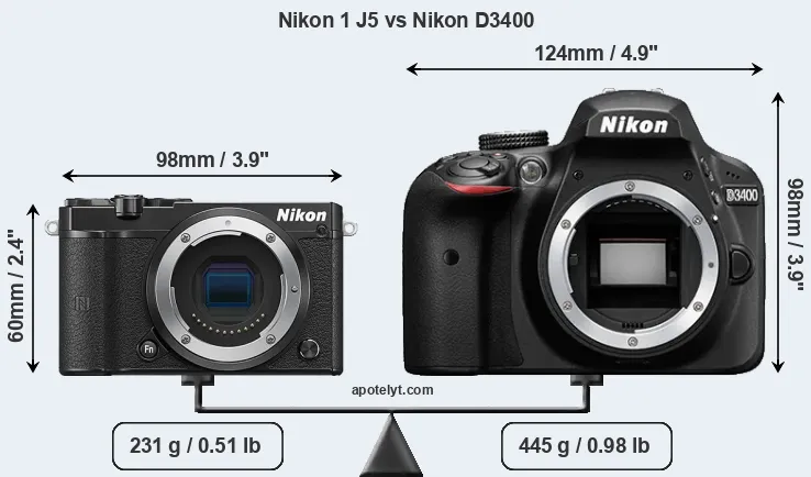 If the front view area (width x height) of the cameras is taken as an aggregate measure of their size, the Nikon D3400 is considerably larger (107 percent) than the Nikon 1 J5. Moreover, the D3400 is substantially heavier (93 percent) than the J5. In this context, it is worth noting that neither the J5 nor the D3400 are weather-sealed.