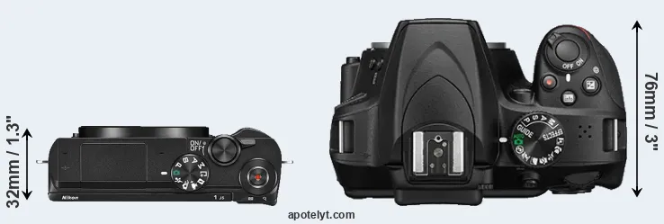 An illustration of the physical size and weight of the Nikon 1 J5 and the Nikon D3400 is provided in the side-by-side display below. The two cameras are presented according to their relative size. Three consecutive views from the front, the top, and the rear side are shown. All width, height and depth dimensions are rounded to the nearest millimeter.