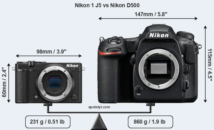 If the front view area (width x height) of the cameras is taken as an aggregate measure of their size, the Nikon D500 is considerably larger (188 percent) than the Nikon 1 J5. Moreover, the D500 is substantially heavier (272 percent) than the J5. It is noteworthy in this context that the D500 is splash and dust-proof, while the J5 does not feature any corresponding weather-sealing.
