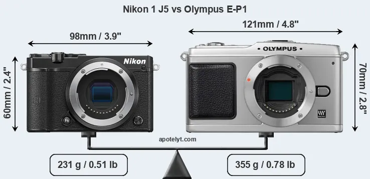 If the front view area (width x height) of the cameras is taken as an aggregate measure of their size, the Olympus E-P1 is considerably larger (44 percent) than the Nikon 1 J5. Moreover, the E-P1 is substantially heavier (54 percent) than the J5. In this context, it is worth noting that neither the J5 nor the E-P1 are weather-sealed.