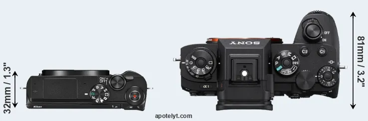 The side-by-side display below illustrates the physical size and weight of the Nikon 1 J5 and the Sony A1. The two cameras are presented according to their relative size. Three consecutive perspectives from the front, the top, and the back are available. All width, height and depth dimensions are rounded to the nearest millimeter.