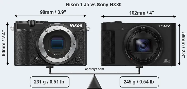 An illustration of the physical size and weight of the Nikon 1 J5 and the Sony HX80 is provided in the side-by-side display below. The two cameras are presented according to their relative size. Three consecutive views from the front, the top, and the rear side are shown. All width, height and depth dimensions are rounded to the nearest millimeter.