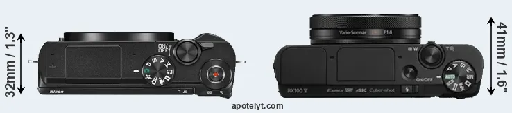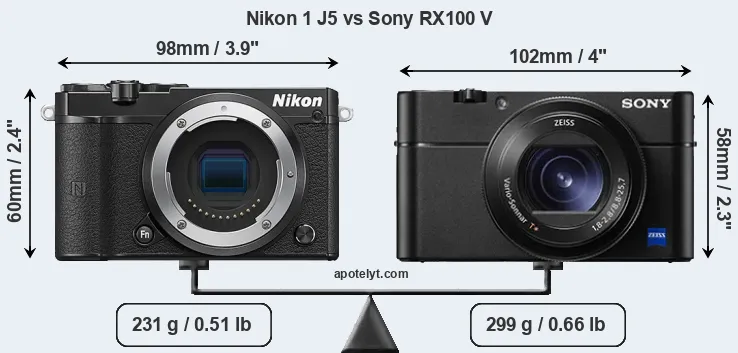 The side-by-side display below illustrates the physical size and weight of the Nikon 1 J5 and the Sony RX100 V. The two cameras are presented according to their relative size. Three successive views from the front, the top, and the rear are shown. All size dimensions are rounded to the nearest millimeter.
