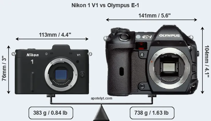 The physical size and weight of the Nikon 1 V1 and the Olympus E-1 are illustrated in the side-by-side display below. The two cameras are presented according to their relative size. Three consecutive perspectives from the front, the top, and the back are available. All width, height and depth dimensions are rounded to the nearest millimeter.