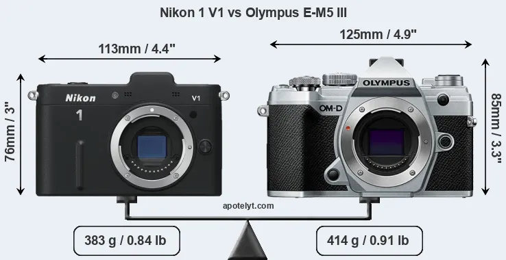 The physical size and weight of the Nikon 1 V1 and the Olympus E-M5 III are illustrated in the side-by-side display below. The two cameras are presented according to their relative size. Three consecutive views from the front, the top, and the rear side are shown. All size dimensions are rounded to the nearest millimeter.