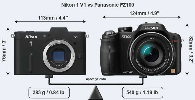 The side-by-side display below illustrates the physical size and weight of the Nikon 1 V1 and the Panasonic FZ100. The two cameras are presented according to their relative size. Three successive views from the front, the top, and the rear are shown. All width, height and depth dimensions are rounded to the nearest millimeter.