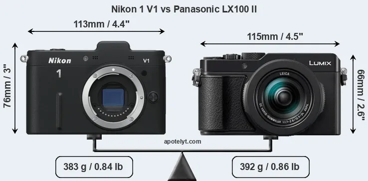 The side-by-side display below illustrates the physical size and weight of the Nikon 1 V1 and the Panasonic LX100 II. The two cameras are presented according to their relative size. Three successive views from the front, the top, and the rear are shown. All width, height and depth dimensions are rounded to the nearest millimeter.