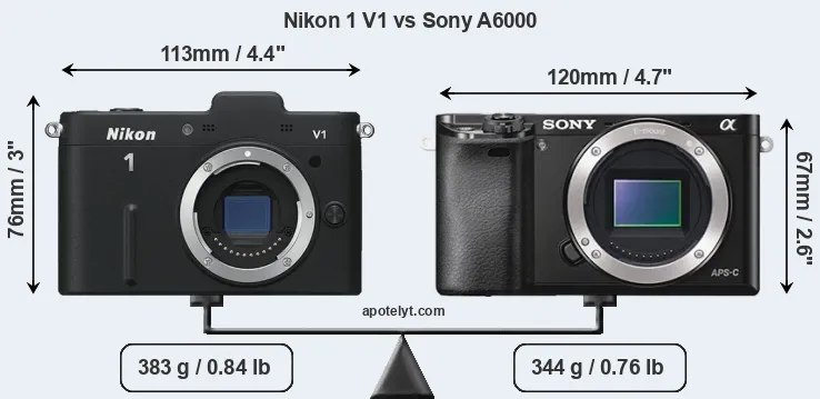 If the front view area (width x height) of the cameras is taken as an aggregate measure of their size, the Sony A6000 is notably smaller (6 percent) than the Nikon 1 V1. Moreover, the A6000 is markedly lighter (10 percent) than the V1. In this context, it is worth noting that neither the V1 nor the A6000 are weather-sealed.