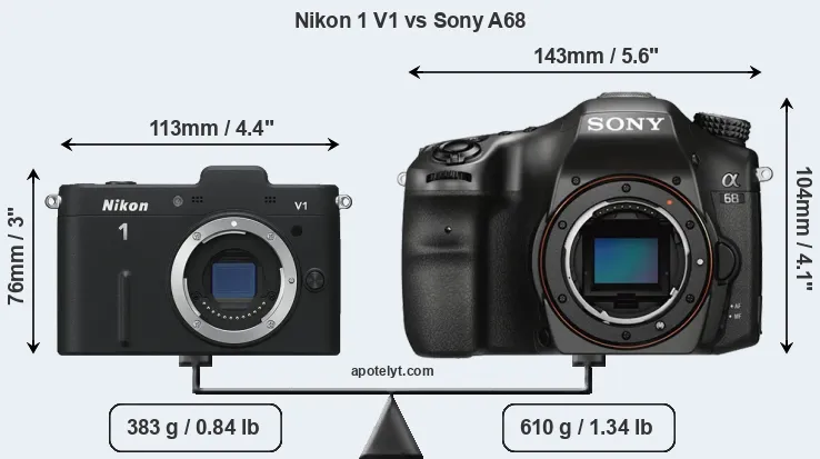 If the front view area (width x height) of the cameras is taken as an aggregate measure of their size, the Sony A68 is considerably larger (73 percent) than the Nikon 1 V1. Moreover, the A68 is substantially heavier (59 percent) than the V1. In this context, it is worth noting that neither the V1 nor the A68 are weather-sealed.