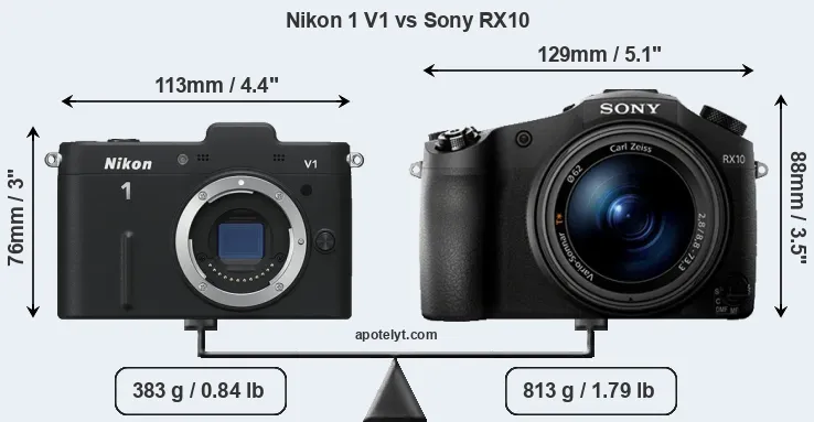 The physical size and weight of the Nikon 1 V1 and the Sony RX10 are illustrated in the side-by-side display below. The two cameras are presented according to their relative size. Three consecutive perspectives from the front, the top, and the back are available. All width, height and depth measures are rounded to the nearest millimeter.