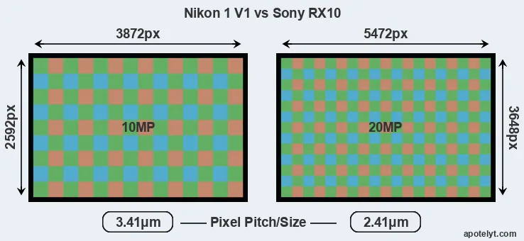While the two cameras under review share the same sensor size, the RX10 offers a higher resolution of 20 megapixels, compared with 10 MP of the V1. This megapixels advantage translates into a 41 percent gain in linear resolution. On the other hand, these sensor specs imply that the RX10 has a higher pixel density and a smaller size of the individual pixel (with a pixel pitch of 2.41μm versus 3.41μm for the V1). However, it should be noted that the RX10 is much more recent (by 2 years) than the V1, and its sensor will have benefitted from technological advances during this time that compensate for the smaller pixel size.