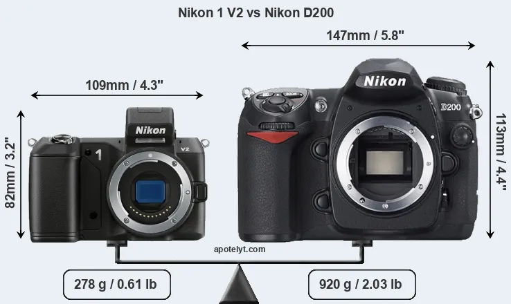 If the front view area (width x height) of the cameras is taken as an aggregate measure of their size, the Nikon D200 is considerably larger (86 percent) than the Nikon 1 V2. Moreover, the D200 is substantially heavier (231 percent) than the V2. It is noteworthy in this context that the D200 is splash and dust-proof, while the V2 does not feature any corresponding weather-sealing.