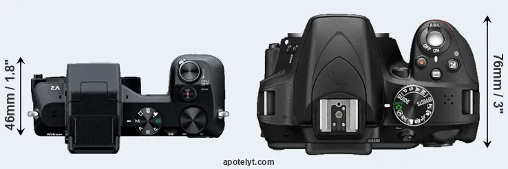 The side-by-side display below illustrates the physical size and weight of the Nikon 1 V2 and the Nikon D3300. The two cameras are presented according to their relative size. Three consecutive views from the front, the top, and the rear side are shown. All width, height and depth dimensions are rounded to the nearest millimeter.