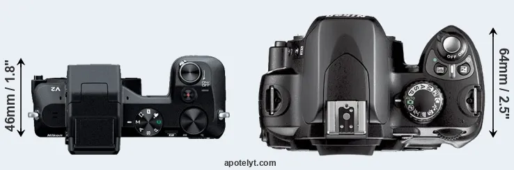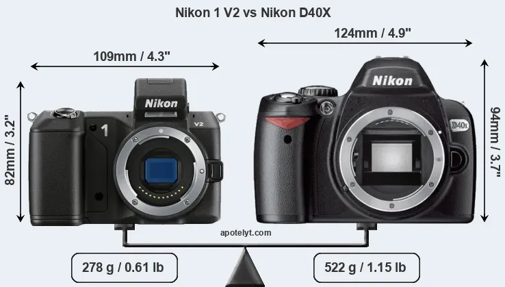 The side-by-side display below illustrates the physical size and weight of the Nikon 1 V2 and the Nikon D40X. The two cameras are presented according to their relative size. Three consecutive perspectives from the front, the top, and the back are available. All width, height and depth dimensions are rounded to the nearest millimeter.
