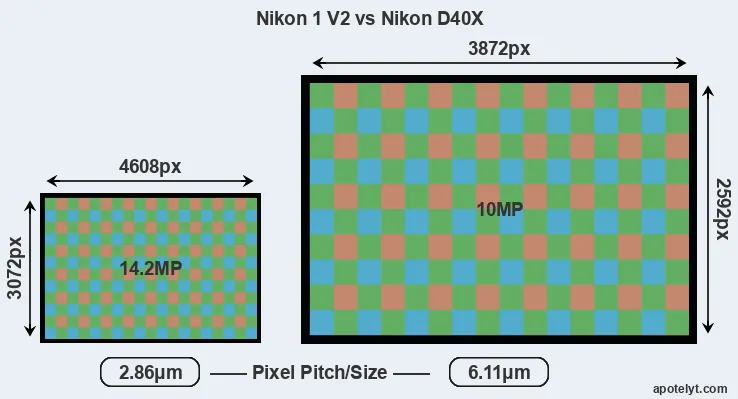 Despite having a smaller sensor, the Nikon 1 V2 offers a higher resolution of 14.2 megapixels, compared with 10 MP of the Nikon D40X. This megapixels advantage comes at the cost of a higher pixel density and a smaller size of the individual pixel (with a pixel pitch of 2.86μm versus 6.11μm for the D40X). However, it should be noted that the V2 is much more recent (by 5 years and 7 months) than the D40X, and its sensor will have benefitted from technological advances during this time that make it possible to gather light more efficiently.