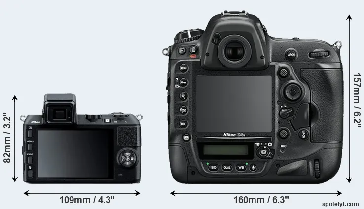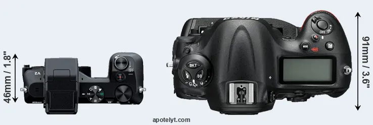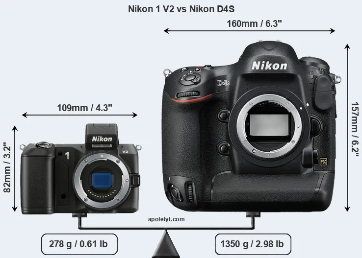 The side-by-side display below illustrates the physical size and weight of the Nikon 1 V2 and the Nikon D4S. The two cameras are presented according to their relative size. Three consecutive perspectives from the front, the top, and the back are available. All width, height and depth measures are rounded to the nearest millimeter.