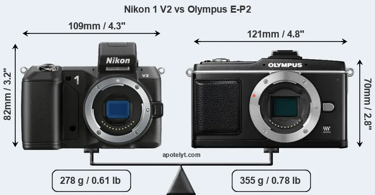 An illustration of the physical size and weight of the Nikon 1 V2 and the Olympus E-P2 is provided in the side-by-side display below. The two cameras are presented according to their relative size. Three successive views from the front, the top, and the rear are shown. All width, height and depth measures are rounded to the nearest millimeter.