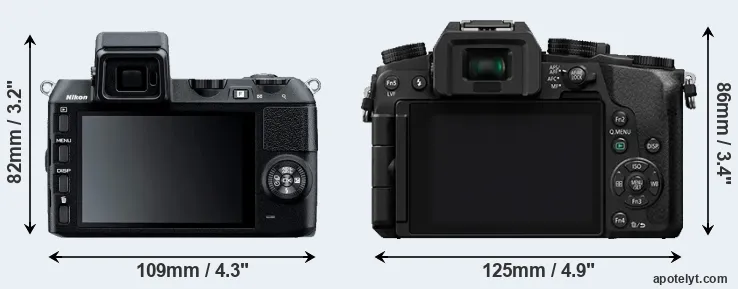 If the front view area (width x height) of the cameras is taken as an aggregate measure of their size, the Panasonic G7 is notably larger (20 percent) than the Nikon 1 V2. Moreover, the G7 is substantially heavier (47 percent) than the V2. In this context, it is worth noting that neither the V2 nor the G7 are weather-sealed.