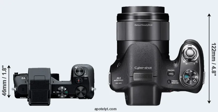 Going beyond this snapshot of core features and characteristics, what are the differences between the Nikon 1 V2 and the Sony Cyber-shot DSC-H400? Which one should you buy? Read on to find out how these two cameras compare with respect to their body size, their imaging sensors, their shooting features, their input-output connections, and their reception by expert reviewers.