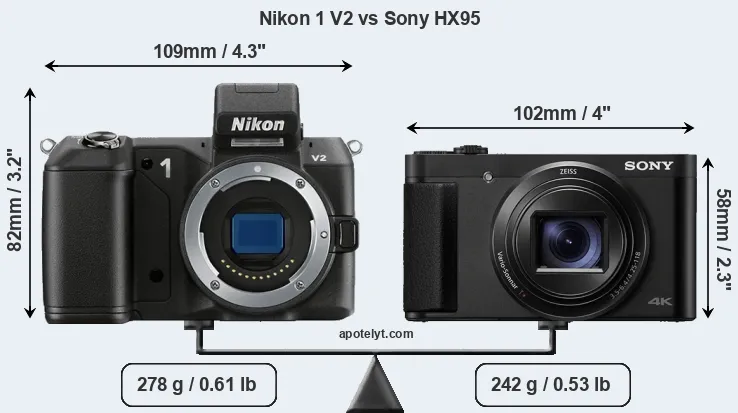 An illustration of the physical size and weight of the Nikon 1 V2 and the Sony HX95 is provided in the side-by-side display below. The two cameras are presented according to their relative size. Three consecutive perspectives from the front, the top, and the back are available. All width, height and depth dimensions are rounded to the nearest millimeter.