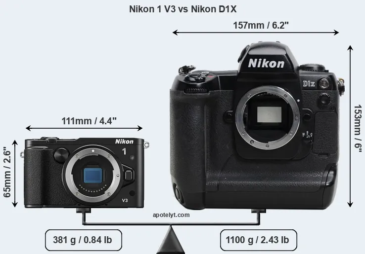 If the front view area (width x height) of the cameras is taken as an aggregate measure of their size, the Nikon D1X is considerably larger (233 percent) than the Nikon 1 V3. Moreover, the D1X is substantially heavier (189 percent) than the V3. It is noteworthy in this context that the D1X is splash and dust-proof, while the V3 does not feature any corresponding weather-sealing.