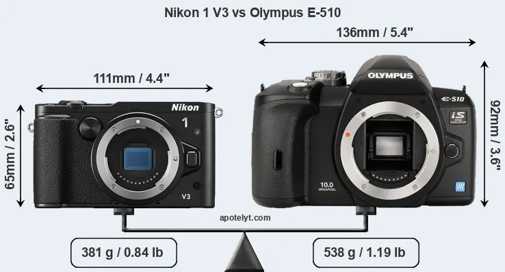 The side-by-side display below illustrates the physical size and weight of the Nikon 1 V3 and the Olympus E-510. The two cameras are presented according to their relative size. Three consecutive perspectives from the front, the top, and the back are available. All width, height and depth measures are rounded to the nearest millimeter.
