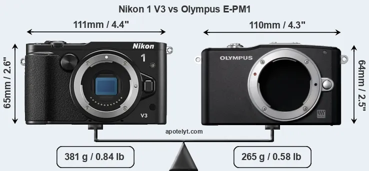 An illustration of the physical size and weight of the Nikon 1 V3 and the Olympus E-PM1 is provided in the side-by-side display below. The two cameras are presented according to their relative size. Three consecutive perspectives from the front, the top, and the back are available. All width, height and depth dimensions are rounded to the nearest millimeter.
