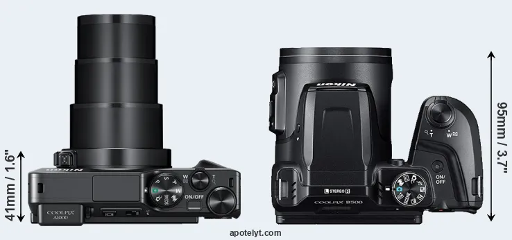 The physical size and weight of the Nikon A1000 and the Nikon B500 are illustrated in the side-by-side display below. The two cameras are presented according to their relative size. Three consecutive perspectives from the front, the top, and the back are available. All width, height and depth measures are rounded to the nearest millimeter.