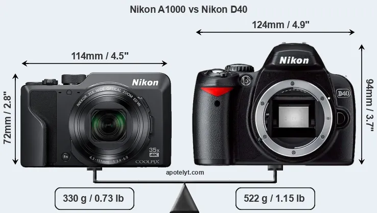 The above size and weight comparisons are to some extent incomplete and possibly misleading, as the A1000 has a lens built in, whereas the D40 is an interchangeable lens camera that requires a separate lens. Attaching the latter will add extra weight and bulk to the setup. You can compare the optics available for the D40 and their specifications in the Nikon Lens Catalog.