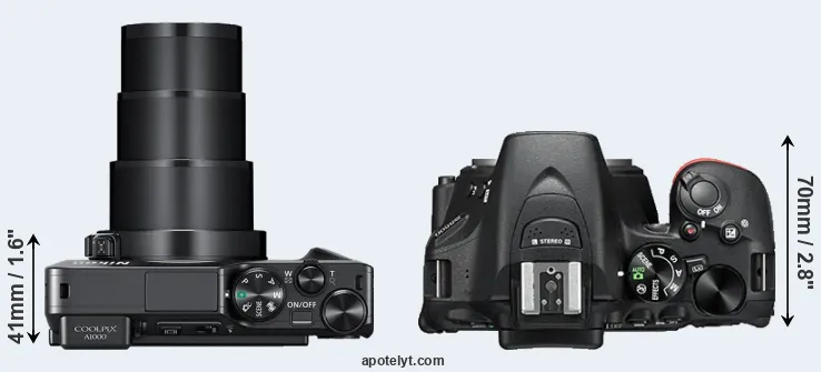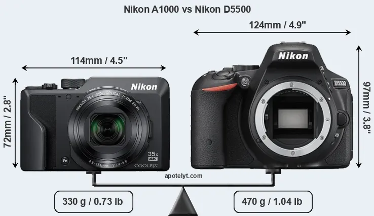 The above size and weight comparisons are to some extent incomplete and possibly misleading, as the A1000 has a lens built in, whereas the D5500 is an interchangeable lens camera that requires a separate lens. Attaching the latter will add extra weight and bulk to the setup. You can compare the optics available for the D5500 and their specifications in the Nikon Lens Catalog.