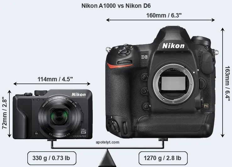 The side-by-side display below illustrates the physical size and weight of the Nikon A1000 and the Nikon D6. The two cameras are presented according to their relative size. Three successive views from the front, the top, and the rear are shown. All width, height and depth measures are rounded to the nearest millimeter.
