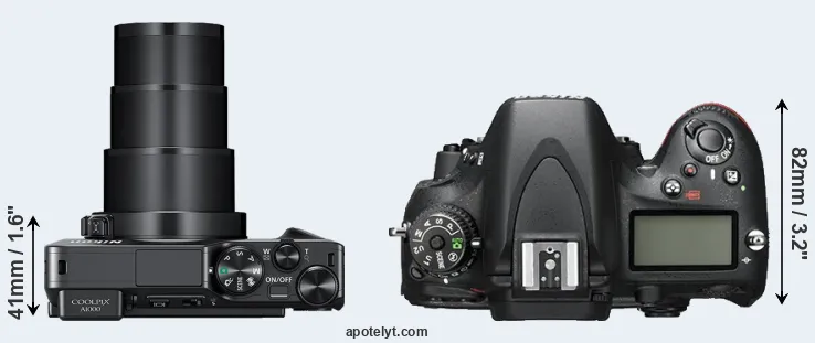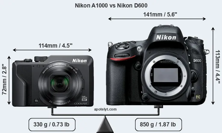 The side-by-side display below illustrates the physical size and weight of the Nikon A1000 and the Nikon D600. The two cameras are presented according to their relative size. Three consecutive perspectives from the front, the top, and the back are available. All width, height and depth measures are rounded to the nearest millimeter.