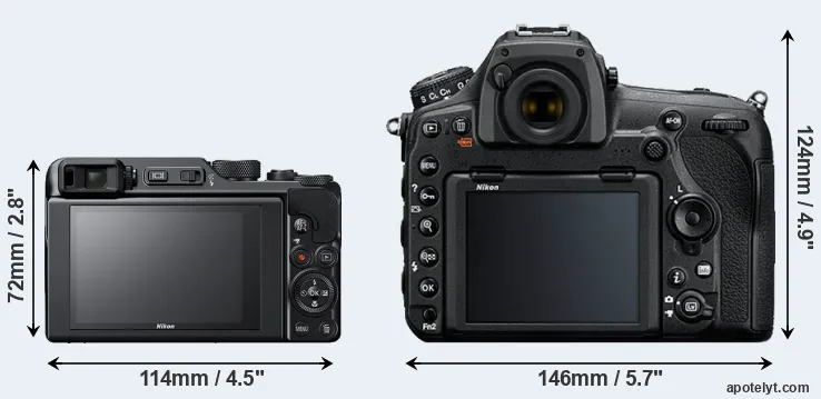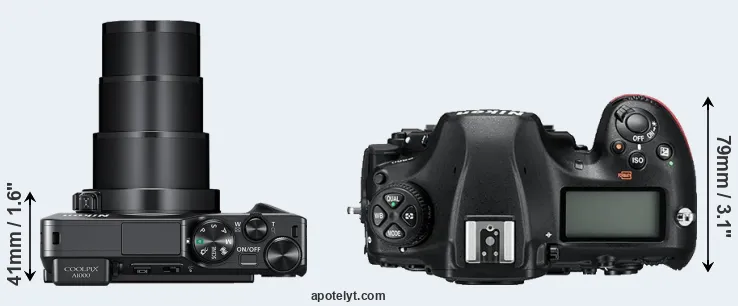 The physical size and weight of the Nikon A1000 and the Nikon D850 are illustrated in the side-by-side display below. The two cameras are presented according to their relative size. Three consecutive perspectives from the front, the top, and the back are available. All width, height and depth dimensions are rounded to the nearest millimeter.