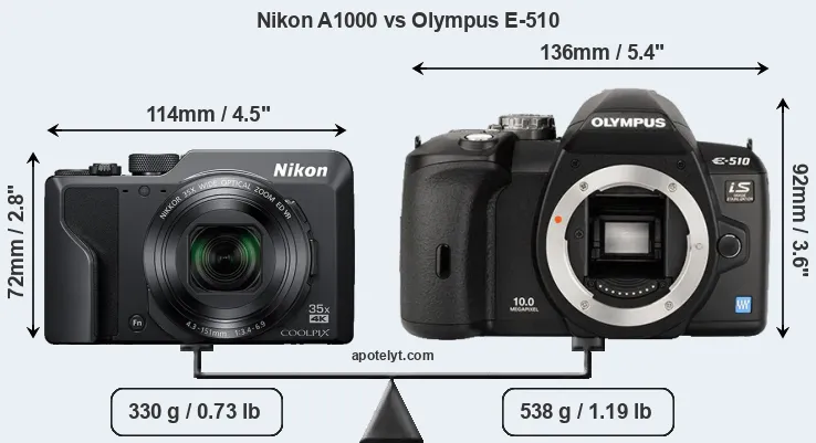 An illustration of the physical size and weight of the Nikon A1000 and the Olympus E-510 is provided in the side-by-side display below. The two cameras are presented according to their relative size. Three consecutive perspectives from the front, the top, and the back are available. All width, height and depth measures are rounded to the nearest millimeter.