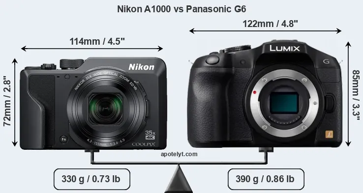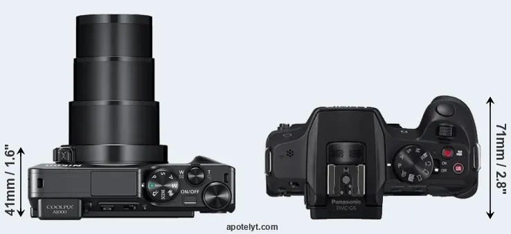 An illustration of the physical size and weight of the Nikon A1000 and the Panasonic G6 is provided in the side-by-side display below. The two cameras are presented according to their relative size. Three consecutive perspectives from the front, the top, and the back are available. All size dimensions are rounded to the nearest millimeter.