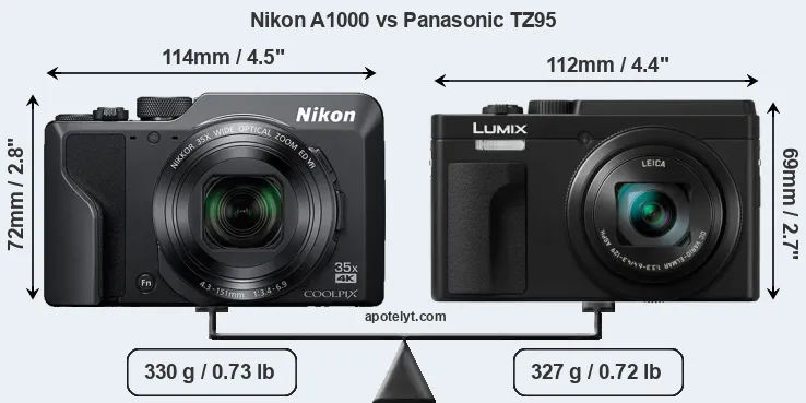 The physical size and weight of the Nikon A1000 and the Panasonic TZ95 are illustrated in the side-by-side display below. The two cameras are presented according to their relative size. Three successive views from the front, the top, and the rear are shown. All width, height and depth measures are rounded to the nearest millimeter.
