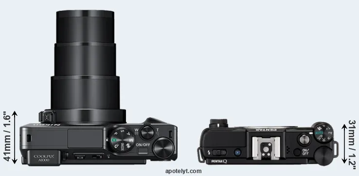 The side-by-side display below illustrates the physical size and weight of the Nikon A1000 and the Pentax Q. The two cameras are presented according to their relative size. Three successive views from the front, the top, and the rear are shown. All size dimensions are rounded to the nearest millimeter.