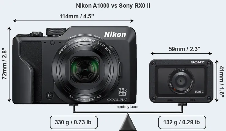 The physical size and weight of the Nikon A1000 and the Sony RX0 II are illustrated in the side-by-side display below. The two cameras are presented according to their relative size. Three successive views from the front, the top, and the rear are shown. All width, height and depth measures are rounded to the nearest millimeter.