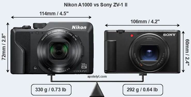 An illustration of the physical size and weight of the Nikon A1000 and the Sony ZV-1 II is provided in the side-by-side display below. The two cameras are presented according to their relative size. Three consecutive perspectives from the front, the top, and the back are available. All width, height and depth measures are rounded to the nearest millimeter.