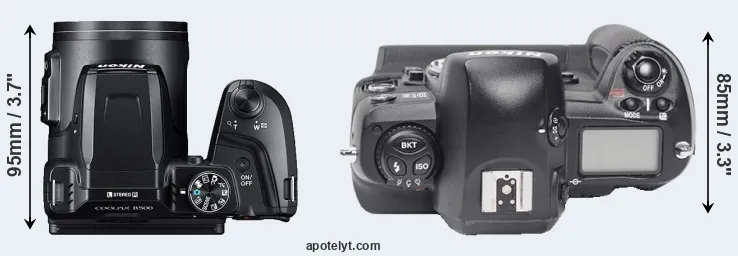 An illustration of the physical size and weight of the Nikon B500 and the Nikon D1X is provided in the side-by-side display below. The two cameras are presented according to their relative size. Three successive views from the front, the top, and the rear are shown. All width, height and depth measures are rounded to the nearest millimeter.