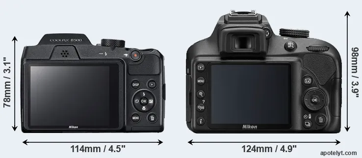 The above size and weight comparisons are to some extent incomplete and possibly misleading, as the B500 has a lens built in, whereas the D3400 is an interchangeable lens camera that requires a separate lens. Attaching the latter will add extra weight and bulk to the setup. You can compare the optics available for the D3400 and their specifications in the Nikon Lens Catalog.