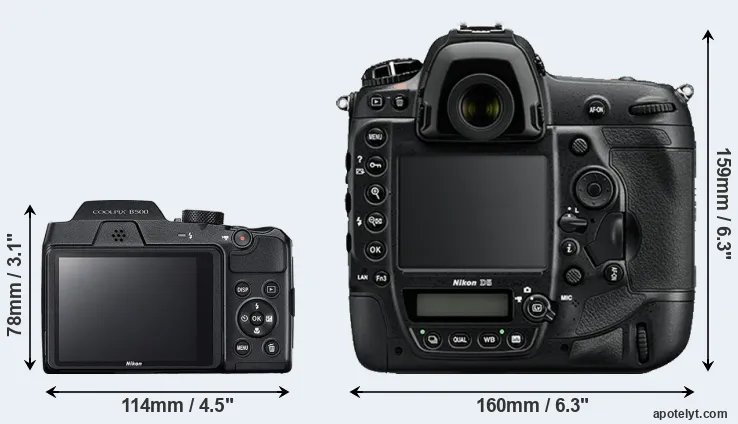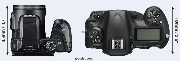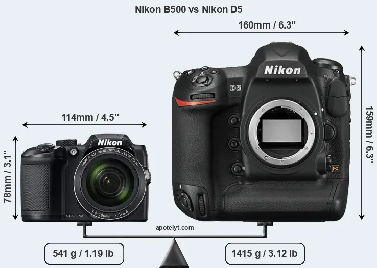 The side-by-side display below illustrates the physical size and weight of the Nikon B500 and the Nikon D5. The two cameras are presented according to their relative size. Three consecutive perspectives from the front, the top, and the back are available. All width, height and depth measures are rounded to the nearest millimeter.